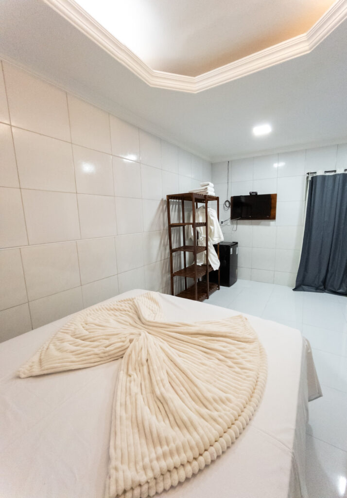 TV à cabo, Wi-Fi, Ar-condicionado, Frigobar, Cama King Size, Chuveiro Quente, Banheira Exclusiva, Café da Manhã Incluso.